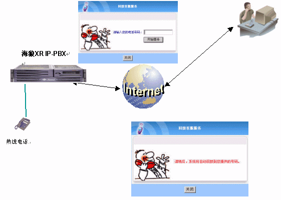 如圖:用戶(hù)在上網(wǎng)訪(fǎng)問(wèn)企業(yè)網(wǎng)站的時(shí)候,如果需要和企業(yè)進(jìn)行聯(lián)系,手邊沒(méi)有麥克風(fēng),就可以使用企業(yè)在網(wǎng)頁(yè)上的CALL-BACK800鏈接,點(diǎn)擊后就彈出一個(gè)窗口,然后輸入身邊的座機(jī)或者手機(jī)號(hào)碼,點(diǎn)擊開(kāi)始服務(wù),窗口出現(xiàn)紅色的"請(qǐng)稍候,系統(tǒng)將自動(dòng)回?fù)艿侥峁┑奶?hào)碼" ,稍等一會(huì)后,用戶(hù)的電話(huà)就會(huì)被呼叫,接通后就可以和企業(yè)的熱線(xiàn)電話(huà)進(jìn)行溝通?梢詫(shí)現(xiàn)和WEB800同樣的效果,但是CALL-BACK800相對(duì)用戶(hù)來(lái)說(shuō)是一個(gè)更方便的溝通方式。