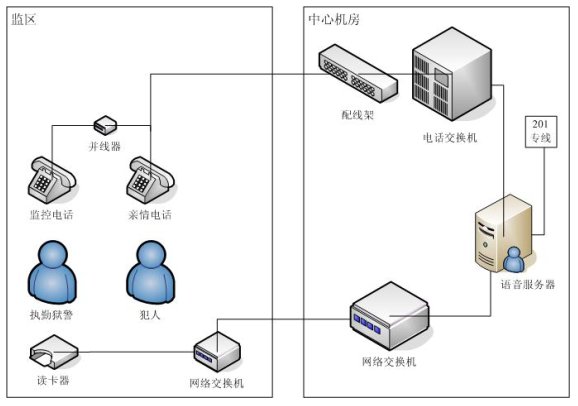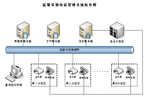 親情電話管理系統(tǒng)在系統(tǒng)設計中充分考慮監(jiān)獄的需求與特點,不但包含了一般親情電話錄音所需的全部功能,而且還融合了獄政管理的功能,整個系統(tǒng)采用集中式方式,在中心機房部署一套親情電話錄音服務器,各個監(jiān)區(qū)監(jiān)控系統(tǒng)利用監(jiān)獄內部的局域網(wǎng)聯(lián)結成一個整體,形成一個能監(jiān)控監(jiān)獄親情電話的全網(wǎng)。這樣即可以在每個監(jiān)區(qū)監(jiān)聽,也可以在監(jiān)獄內部網(wǎng)的任何地方對親情電話進行全程監(jiān)視。該系統(tǒng)能夠完全滿足目前監(jiān)獄的需求,產(chǎn)品性價比遠遠高于市場上其他同類產(chǎn)品。
