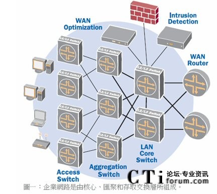 復(fù)雜的網(wǎng)絡(luò)拓?fù)?/b>:網(wǎng)絡(luò)架構(gòu)因內(nèi)含龐雜的多層網(wǎng)絡(luò),而變得越來(lái)越復(fù)雜。目前多數(shù)企業(yè)網(wǎng)絡(luò)都是三層式拓?fù)洌〝?shù)據(jù)匯聚層或分發(fā)層。許多網(wǎng)絡(luò)都已部署了匯聚交換機(jī),以彌補(bǔ)傳統(tǒng)存取及核心交換機(jī)欠缺高速光纖接口的缺陷,以便支持直接的連接。有些企業(yè)甚至建立了第四層網(wǎng)絡(luò),由連接到核心交換機(jī)的核心路由器組成。這樣的網(wǎng)絡(luò)架構(gòu)雖然可以發(fā)揮一定的作用,但卻大幅增加了資本支出,造成操作流程過(guò)于復(fù)雜,并為管理帶來(lái)沉重負(fù)擔(dān)。此外,這類架構(gòu)也會(huì)增加網(wǎng)絡(luò)的等待時(shí)間,并導(dǎo)致超額負(fù)載的情況出現(xiàn),因而降低了應(yīng)用效能。