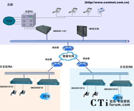 方案組網說明:通過呼叫中心服務器E1接口聯(lián)系數(shù)字中繼CNG8000-1*E1, 遠程座席接CNG3000FXS ,遠程PSTN接CNG3000FXO設備,上述設備統(tǒng)一注冊到CMC軟交換上。