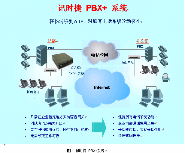將訊時(shí)捷?IPX放在公司總部,其它分支機(jī)構(gòu)可以通過(guò)IP話機(jī),軟電話或者網(wǎng)關(guān)設(shè)備登錄到總部的IPX上,這樣就形成了整個(gè)公司的VOIP網(wǎng),建立了企業(yè)自己的通訊平臺(tái)。