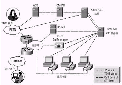 通過(guò)一個(gè)容納了ACD、IVR、Web和電子郵件服務(wù)器、桌面應(yīng)用以及其他內(nèi)容的計(jì)劃,Cisco ICM軟件使公司能夠利用Internet或PSTN實(shí)現(xiàn)與客戶的交互。