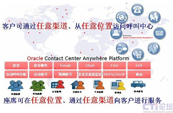 Center Anywhere的多通道技術(shù),能提供完善的“從客戶到座席”體驗。甲骨文把聯(lián)絡(luò)中心技術(shù)與客戶關(guān)系管理和商業(yè)智能更緊密地結(jié)合起來,幫助客戶降低集成完全不同的聯(lián)絡(luò)中心與客戶管理管理資料、分析和通信技術(shù)的成本與復(fù)雜性。