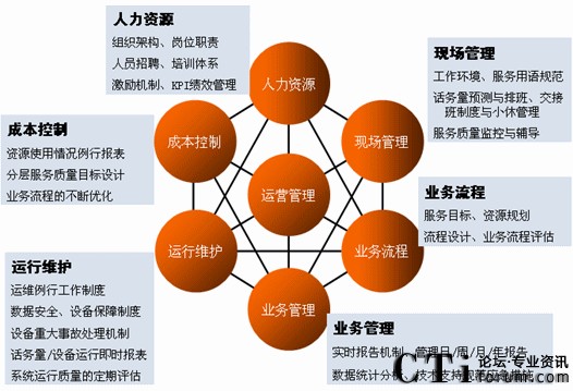 一般來講,呼叫中心的運(yùn)營管理由人力資源、現(xiàn)場管理、成本控制、運(yùn)行維護(hù)、業(yè)務(wù)管理、業(yè)務(wù)流程六種要素組成。這六者之間的關(guān)系正如下圖所示:
