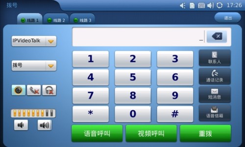 7寸大屏搭配寬大的數(shù)字虛擬鍵盤,讓你的撥號準確無誤。同時界面的所顯示的通話功能諸如查找聯(lián)系人、查找通話記錄、發(fā)送短消息或者快速進入語音信箱等功能也清晰明了?梢园l(fā)現(xiàn)的是,用戶在輸完號碼之后可自主選擇采用語音呼叫還是視頻呼叫。另外,同潮流網(wǎng)絡之前的一款視頻電話GXV3140一樣的是,GXV3175也在出廠自帶了一個IPVideoTalk賬號。該賬號是出廠時就已配置好的,每一臺電話配備一個號碼并顯示在桌面上。也就是說,用戶在拿到GXV3175并聯(lián)網(wǎng)之后即可使用該賬號撥打免費的視頻電話了。這可是很多廠商所沒有的特殊功能。下面我們就使用隨機附送的IPVideoTalk賬號來撥打視頻電話。