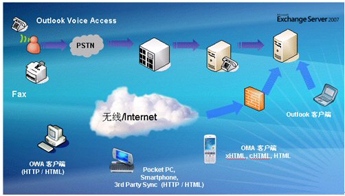 客戶端可以通過Outlook,Web,固話語音和手機接入,查看相關的郵件以及日程安排等信息。如下圖: