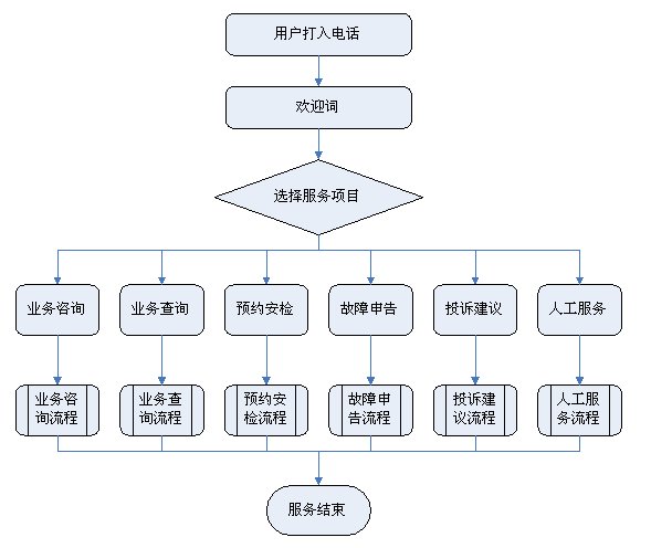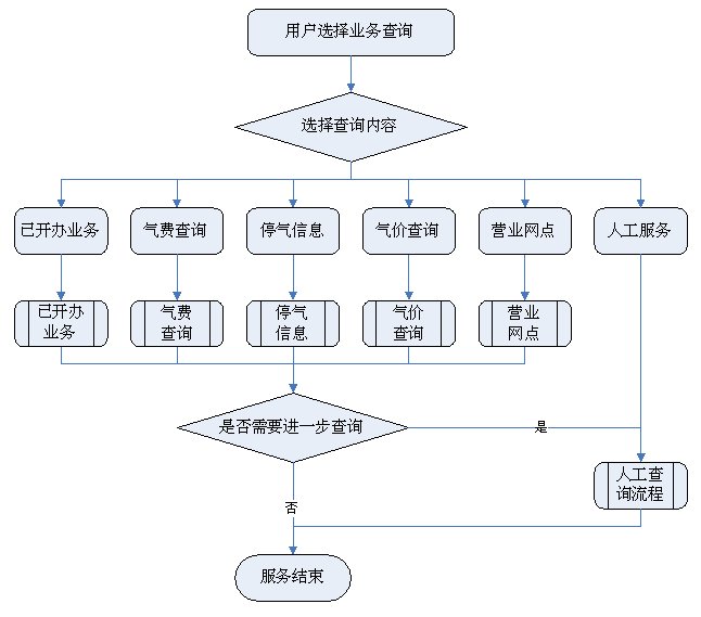 1)業(yè)務(wù)咨詢:用戶通過(guò)人工、自動(dòng)語(yǔ)音等方式咨詢有關(guān)政策法規(guī)、資費(fèi)標(biāo)準(zhǔn)、用氣常識(shí)、報(bào)裝方法等,系統(tǒng)以語(yǔ)音、傳真、Email、短消息等方式回復(fù)客戶。