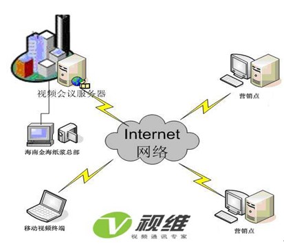 視維團(tuán)隊(duì)根據(jù)海南金海紙漿的網(wǎng)絡(luò)現(xiàn)狀和IT硬件資源以及低碳環(huán)保高效溝通的需求設(shè)計(jì)了一套經(jīng)濟(jì)可行的視頻會(huì)議系統(tǒng)解決方案,以海南金海紙漿為主會(huì)場,全國各營銷點(diǎn)為分會(huì)場。拓?fù)鋱D如下: