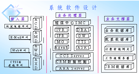 平臺除支持傳統(tǒng)的電話和傳真接入方式之外,還支持短消息方式(用于客戶通知),以后通過擴展各種接入網關(例如尋呼網關)和內容服務器(例如WWW、E-Mail、WAP等),平臺還支持WAP、WEB、E-Mail、等多種多媒體的接入方式。