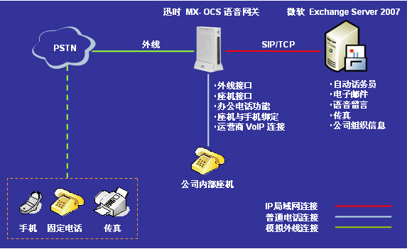 迅時(shí)通信針對(duì)微軟統(tǒng)一溝通解決方案,在2008年推出了MX-OCS系列辦公型VoIP語(yǔ)音網(wǎng)關(guān)。將微軟Exchange Server 2007 統(tǒng)一消息服務(wù)器與迅時(shí)通信MX-OCS網(wǎng)關(guān)集成而構(gòu)成的解決方案(簡(jiǎn)稱“1+1”方案),能大幅降低中小企業(yè)擁有統(tǒng)一溝通平臺(tái)的成本。
