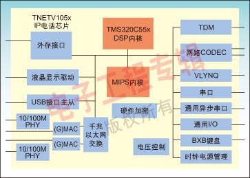 TI提供全面的VoIP解決方案,覆蓋IP電話、家庭網(wǎng)關(guān)、電信級(jí)網(wǎng)關(guān)以及VoADSL和VoCable。針對企業(yè)級(jí)IP電話需求,TI提供了多種解決方案,其中TNETV1050/TNEV1055的SoC方案基于TI的TMS320C55x DSP系列的可編程DSP和增強(qiáng)的32位MIPS內(nèi)核。它使用先進(jìn)的系統(tǒng)架構(gòu),在提供高性能低功耗的同時(shí),兼顧系統(tǒng)的可擴(kuò)展性,還包括豐富的外設(shè)接口,滿足設(shè)計(jì)企業(yè)級(jí)電話系統(tǒng)的要求。