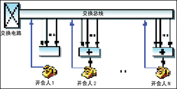 系統(tǒng)集中提供一組或多組電話會議資源,然后利用交換總線將所有需要參加某個會議的話路交換至特定的電話會議資源,從而實現(xiàn)會議應用。如圖1所示。
