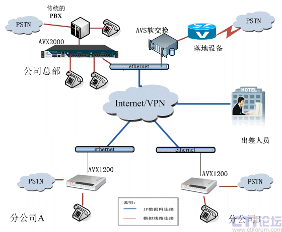 如圖所示:公司總部使用傲威通信的AVX2000注冊(cè)到AVS軟交換網(wǎng)絡(luò),分機(jī)電話可以通過網(wǎng)絡(luò)撥打VoIP出局,同時(shí)也可以通過O口實(shí)現(xiàn)網(wǎng)絡(luò)備用出局和PSTN撥入總機(jī)。