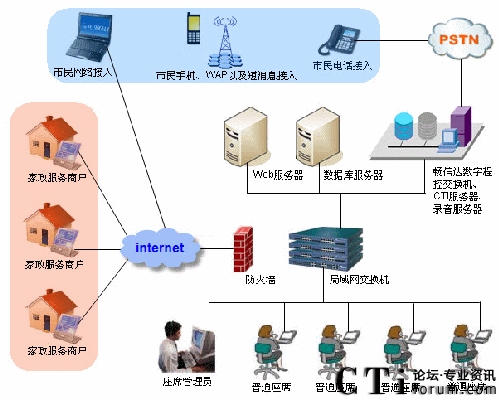 隨著國內(nèi)城市化地不斷加快,人口老齡化的加劇,人民群眾對家政服務(wù)需求也越來越旺盛,家政服務(wù)業(yè)的重要性也日益凸顯。為了規(guī)范家政服務(wù)市場、整合家政市場資源、培育家政服務(wù)示范性企業(yè),國家商務(wù)部、財務(wù)部于2009年4月下發(fā)了《關(guān)于推進(jìn)家政服務(wù)網(wǎng)絡(luò)體系建設(shè)的通知》的149號文件,啟動了家政服務(wù)網(wǎng)絡(luò)中心體系建設(shè)的項目,并提出了具體的規(guī)范和要求。以此為起點(diǎn),為更好地服務(wù)社會滿足人民群眾日益增長的生活需求而努力。自文件下發(fā)以來,我公司就組織專門的項目組,對家政服務(wù)行業(yè)具體業(yè)務(wù)需求的調(diào)研以及開發(fā)工作。公司利用多年的開發(fā)經(jīng)驗,經(jīng)過幾個月的努力,終于在8月份完成了暢信達(dá)家政服務(wù)網(wǎng)絡(luò)中心的全套建設(shè)方案。與其它系統(tǒng)固化的功能設(shè)計不同,該方案可以靈活地定制業(yè)務(wù)模塊,方便各地的家政公司根據(jù)本市的情況和需求,確定適合自身的業(yè)務(wù)流程。系統(tǒng)業(yè)務(wù)模塊完整地覆蓋了家政服務(wù)的業(yè)務(wù)范圍與重點(diǎn)。并將家政服務(wù)的業(yè)務(wù)分為營業(yè)系統(tǒng)、賬務(wù)系統(tǒng)、后臺系統(tǒng)等部分,貫穿了市民從訴求提交、工單派發(fā)、工單處理、財務(wù)結(jié)算到回訪反饋的各個方面。系統(tǒng)還提供了完善的報表模塊準(zhǔn)確反映業(yè)務(wù)和系統(tǒng)運(yùn)營狀況,有力地支持對平臺進(jìn)行運(yùn)營管理工作。另外在方案設(shè)計上,除了滿足業(yè)務(wù)處理需要外,還充分考慮到系統(tǒng)的適應(yīng)性、穩(wěn)定性和處理的能力。首先為了滿足各地市對家政平臺的不同需求,公司專門推出了基于IBM服務(wù)器的和暢信達(dá)標(biāo)配服務(wù)器的兩種建設(shè)方案。暢信達(dá)標(biāo)配服務(wù)器方案可提供最低4模擬外線最多1條數(shù)字中繼(E1)接入,適用于初期規(guī)模較小且投資規(guī)模不大的客戶。而基于IBM服務(wù)器的方案,則主要是滿足業(yè)務(wù)量較大,同時對設(shè)備配置要求高的城市,以數(shù)字線接入為主。多種建設(shè)模式充分體現(xiàn)了方案的靈活性、可擴(kuò)展性的特征,有效地減少了運(yùn)營風(fēng)險,提升了個性化定制化服務(wù)的水平。其次,根據(jù)家政市場需求預(yù)測以及已開通家政服務(wù)網(wǎng)絡(luò)中心城市的實(shí)際運(yùn)營情況,一個中型城市,預(yù)計電話開通之后,話務(wù)量平均每天近3000個,這就要求系統(tǒng)不但有穩(wěn)定的性能而且要有強(qiáng)大的處理能力。我公司從系統(tǒng)平臺構(gòu)建、業(yè)務(wù)流程設(shè)計、設(shè)備性能、組網(wǎng)設(shè)計等方面著手,為系統(tǒng)提供了足以確保安全穩(wěn)定運(yùn)行的支持。