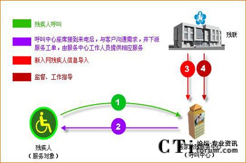 根據(jù)服務(wù)轄區(qū)內(nèi)殘疾人的情況,殘聯(lián)將需要提供居家服務(wù)的對象提供給服務(wù)中心,服務(wù)中心將殘疾人檔案信息上傳于系統(tǒng)內(nèi)。當(dāng)殘疾人通過手機或固定電話撥打“服務(wù)中心服務(wù)統(tǒng)一電話號碼”(或采用一鍵呼叫的話機呼叫“服務(wù)中心服務(wù)統(tǒng)一電話號碼”)時,服務(wù)中心的座席電腦上就會彈出殘疾人信息(包括:名字、地址、聯(lián)系電話、殘疾類別與等級、身份證號碼、殘疾證號、監(jiān)護人性姓名、監(jiān)護人電話等等)。具體流程如下: