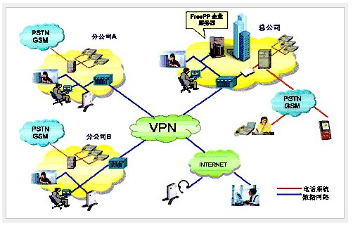 FreePP獨有的群組功能可以幫助企業(yè)將其總部與分支機構原本各自獨立的若干個PBX整合成為一個PBX,實現(xiàn)Internet、PSTN網絡上通信應用的融合,幫忙企業(yè)擺脫對傳統(tǒng)通信運營商的依賴,完全掌握自己的通信網絡。通過為PBX外線上的若干個FreePP Box (或MPES)分配一個Group Number,PBX內線上的分機按照PBX上的設定來獲取Group Number中的一個FreePP Box,進而通過這個FreePP Box來呼叫另外一組Group Number 連接的PBX分機號碼。他們相互間的通信完全基于Internet實現(xiàn),無需象傳統(tǒng)方式那樣交納通信費用。