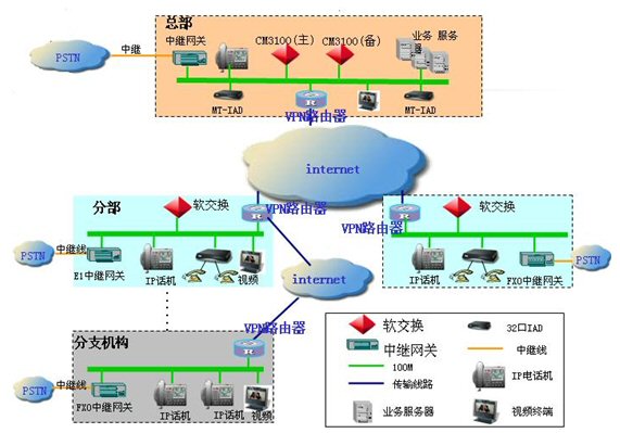 在分部配置軟交換CM3100和中繼網(wǎng)關(guān),中繼網(wǎng)關(guān)通過數(shù)字中繼線路連接程控交換機,實現(xiàn)VOIP網(wǎng)絡(luò)與PSTN的互聯(lián)互通,根據(jù)實際需要部署IAD或IP話機,以滿足最終電話用戶的需求。