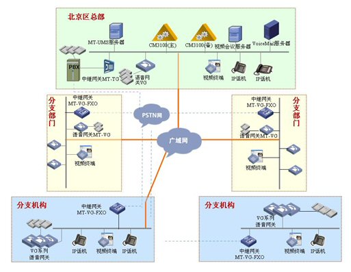 中心與各分部之間通過VOIP方式解決內(nèi)部通話問題,分部撥打北京區(qū)域的PSTN電話時從北京的中繼出局,節(jié)省了長途話費(fèi);北京的員工撥打分部的PSTN電話,從分部出局,如下圖: