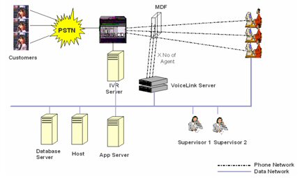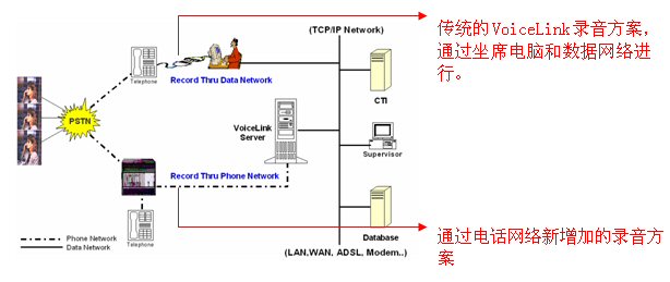 在Voicelink 電話網(wǎng)絡錄音方案下,語音可以通過每條的電話線獲得并能連接到Voicelink服務器上。語音將在Voicelink服務器里被處理,該服務器內(nèi)裝有語音卡。通過電話“摘機”和“掛機”的動作來啟動錄音和結(jié)束錄音。在TCP/IP的網(wǎng)絡下,主管可以調(diào)聽錄音并通過登陸到服務器上進行用戶管理。