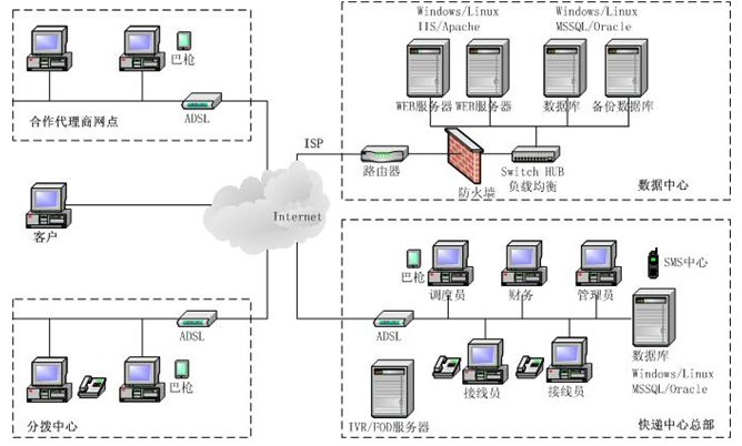 硬件部分包含   軟件部分具有以下功能:  EIM快遞業(yè)務(wù)綜合管理系統(tǒng)的優(yōu)勢:    EIM快遞業(yè)務(wù)綜合管理系統(tǒng)不僅采用計算機(jī)統(tǒng)計分析功能快速分析指定相關(guān)派送人員完成快遞工作,還采用短信派單的方式直接使用計算機(jī)發(fā)送短信,實現(xiàn)快遞過程中的必要的信息溝通,可以降低企業(yè)的通訊成本70%左右。    從客戶來電、客服接聽、調(diào)度分派 、運單打印、出庫入庫、提成結(jié)算、統(tǒng)計報表、售后服務(wù)、客戶管理等EIM快遞業(yè)務(wù)綜合管理系統(tǒng)將快遞業(yè)務(wù)流程系統(tǒng)化、規(guī)范化,方便了企業(yè)的管理。    EIM快遞業(yè)務(wù)綜合管理系統(tǒng)充分運用了客服呼叫中心和短信技術(shù),智能化地生成客戶資料,減少了重復(fù)勞動,提高了服務(wù)效率。    本系統(tǒng)具備語音導(dǎo)航、語音查詢等功能,EIM系統(tǒng)使快遞公司以較少的投入實現(xiàn)相對完善的呼叫中心功能,實現(xiàn)24小時客戶服務(wù),使企業(yè)的服務(wù)更加完善。