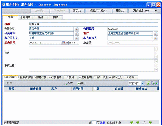 服務(wù)合同是也分為兩種,一種是非公司項目的服務(wù)請求此時沒有與訂單關(guān)聯(lián);二種是公司項目后服務(wù)請求,此時可以關(guān)聯(lián)訂單也可以不關(guān)聯(lián)訂單,如果關(guān)聯(lián)訂單就可以將訂單產(chǎn)品明細導入合同明細中(導入明細是可以調(diào)整數(shù)量和價格的).