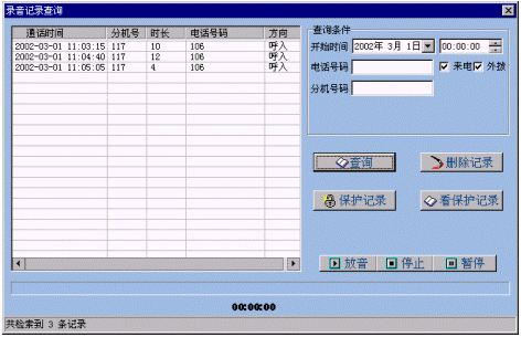 根據(jù)該操作員的類別判定該操作員具有那些權(quán)限(查詢、管理、監(jiān)聽等),具備查詢權(quán)限的操作員可以按時間、分機號、來去點號碼等來查詢所有的錄音信息;具備管理權(quán)限的操作員可以進行操作員管理以及對系統(tǒng)相關(guān)參數(shù)的設(shè)置;具備監(jiān)聽權(quán)限的操作員可以監(jiān)聽其他坐席的實時狀態(tài)。