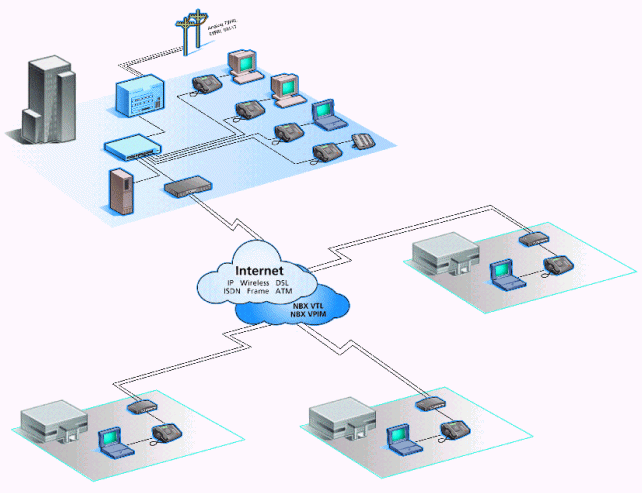 注:企業(yè)架設NBX通訊系統(tǒng)后,實現(xiàn)SOHO辦公只需要接入Internet架設VPN網(wǎng)絡,員工可通過小區(qū)寬帶接入或ADSL接入即可實現(xiàn)內(nèi)部通訊就像在企業(yè)內(nèi)部辦公一樣通訊不受任何限制?蛻魜黼姇r只需撥打分機號,無論員工在任何地點都可接聽來電。企業(yè)可以通過TCA(通訊助理)軟件給員工發(fā)送公告、組建電話會議、短信通知等應用。
