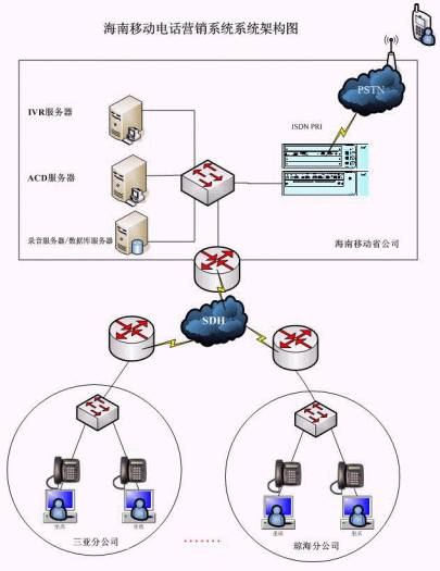 此次為電話營銷系統(tǒng)一期工程,在省公司部署一套NBX V5000系統(tǒng)及相應(yīng)的CTI服務(wù)器,通過2條E1接入PSTN,在18個(gè)地市直接部署50個(gè)IP電話終端及坐席端軟件,語音走移動已有的MDCN網(wǎng)絡(luò),一個(gè)集中受理分布處理的呼叫中心系統(tǒng)就建設(shè)起來啦,本次工程從設(shè)備到貨、系統(tǒng)上線試運(yùn)行,僅僅用了1個(gè)星期,我們海南移動公司的項(xiàng)目經(jīng)理都驚訝的說"太快啦啦,要是使用傳統(tǒng)的排隊(duì)機(jī)部署一個(gè)分布全省的類似系統(tǒng),少說工期也得幾個(gè)月"。經(jīng)過1個(gè)月的試運(yùn)行,系統(tǒng)運(yùn)行穩(wěn)定,各項(xiàng)系統(tǒng)指標(biāo)滿足合同要求,在11月份系統(tǒng)順利通過初驗(yàn)。