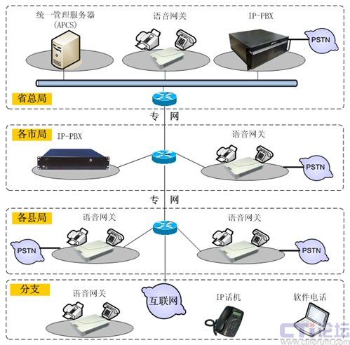 摘要:公司Zed-3(捷思銳科技)公司借助工商系統(tǒng)現(xiàn)有的數(shù)據(jù)專網(wǎng),在省局部署大型IP PBX,負(fù)責(zé)省局的分機(jī)注冊(cè)以及整套系統(tǒng)的路由規(guī)劃,在各市局部署中型IP PBX,負(fù)責(zé)市、縣局的分機(jī)注冊(cè)――充分利用現(xiàn)有資源、降低工作費(fèi)用,擴(kuò)展新業(yè)務(wù),推進(jìn)工商系統(tǒng)通信網(wǎng)絡(luò)的全面提升。