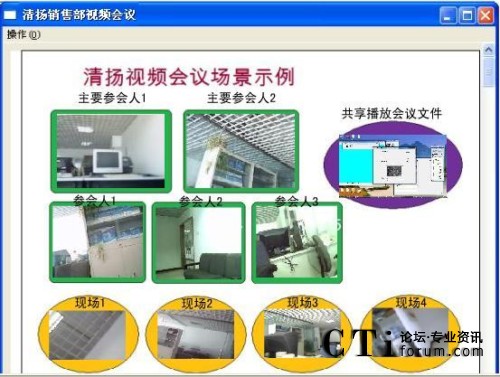簡單的操作以后,一個生動的會議場面就出現(xiàn)在眼前。效果如圖一所示。軟件屏幕墻的使用讓每個參會人又重新找回了聚在了一個會議室里進行會議的感覺。 具體的操作請參見用戶手冊會議屏幕墻的使用。