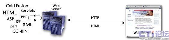 在互聯(lián)網(wǎng)上,瀏覽器通過Internet協(xié)議――比如HTTP――向Web服務(wù)器發(fā)出請求,而Web服務(wù)器上存放著靜態(tài)頁面和動(dòng)態(tài)應(yīng)用,它們將把HTML返回給瀏覽器,最終結(jié)果在瀏覽器中展現(xiàn)出來。如下圖所示: