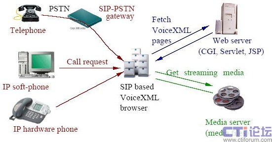 SIP(會話啟動協(xié)議)[2]是用于建立和終止因特網多媒體會話的因特網電話信令協(xié)議;赟IP的VoiceXML瀏覽器(或稱SIP-VoiceXML瀏覽器)允許SIP用戶參與專用IVR系統(tǒng),比如語音郵件和遠程銀行。通過SIP-PSTN網關,它還可以把VoiceXML技術的優(yōu)勢帶給傳統(tǒng)電話用戶。