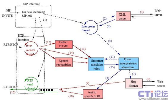1. 當瀏覽器接收到一個新進來的SIP呼叫后,它創(chuàng)建三個不同線程:RTP接收線程、RTP發(fā)送線程和VoiceXML解釋器線程。RTP接收線程從主叫方接收媒體數(shù)據(jù)包并調用DTMF檢測模塊;RTP發(fā)送線程將媒體數(shù)據(jù)包以流的方式發(fā)送給主叫方。一個單獨的發(fā)送線程幫助維護外出數(shù)據(jù)報的固定帶寬(比如針對G.711音頻的64 kb/s),而不考慮語音合成速度。初始的VoiceXML頁面地址可以預先配置在瀏覽器中,或者編碼到SIP請求。例如,如果主叫方撥打sip:dialog.vxml.http%3a//dialogs.server.com/script32.vxml@vxmlservers.com,那么該呼叫將到達運行在vxmlservers.com上的瀏覽器,然后從script32.vxml取得初始VoiceXML頁面。