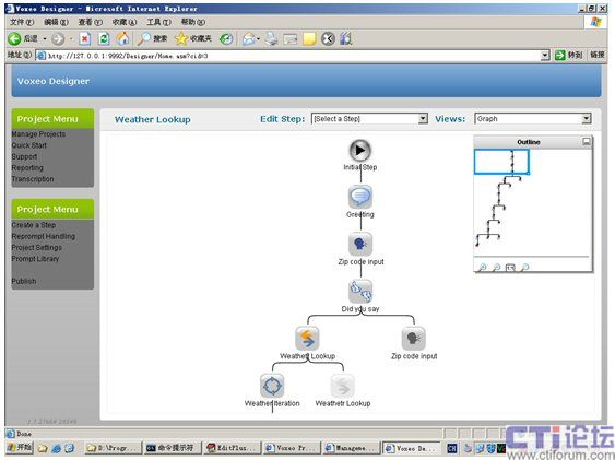 首先要做的是花一些時間前往http://cn.voxeo.com/prophecy/,免費下載一個Prophecy 8.0。安裝完成后,會在系統(tǒng)托盤區(qū)生成一個Voxeo Prophecy v8.0.221.3圖標,選擇Prophecy Home,在打開的Voxeo Prophecy網頁中點擊Prophecy Designer即開始了我們創(chuàng)建VoiceXML項目的輕松之旅。該設計工具將整個VoiceXML應用以圖表或樹狀結構直觀地呈現(xiàn)給開發(fā)者,可以方便地控制和修改其交互流程,如圖3所示。