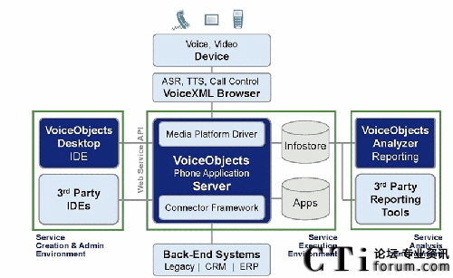 VoiceObjects體系結構支持輕松地開發(fā)、部署和維護帶有語音、視頻、文本和移動互聯(lián)網(wǎng)接口的電話應用。通過緊密集成提供實時分析的VoiceObjects分析器和提供應用創(chuàng)建與維護的VoiceObjects桌面,VoiceObjects服務器成為提供動態(tài)對話和接口生成的執(zhí)行引擎。