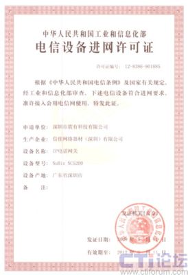 CTI論壇(ctiforum)05月15日消息: 日前從深圳市震有科技有限公司傳出消息,公司自主研發(fā)的NuBiz NC5200 IP電話網(wǎng)關(guān)設(shè)備順利通過工業(yè)和信息化部電信設(shè)備認(rèn)證中心的審核,取得“電信設(shè)備進(jìn)網(wǎng)許可證”。此舉標(biāo)志著震有科技的NuBiz交換產(chǎn)品已成功取得進(jìn)入國家電信網(wǎng)的資質(zhì),為大規(guī)模電信級推廣應(yīng)用打下了基礎(chǔ)。