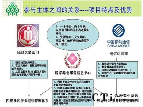 項(xiàng)目運(yùn)作思路,以專業(yè)的運(yùn)營(yíng)機(jī)構(gòu)(民辦非企業(yè))作為項(xiàng)目支撐點(diǎn),將政府推動(dòng)居家養(yǎng)老服務(wù)體系建設(shè)的需求和電信運(yùn)營(yíng)商要擴(kuò)大和穩(wěn)定用戶群的需求向結(jié)合,共同建設(shè)和推動(dòng)居家養(yǎng)老呼叫服務(wù)網(wǎng)絡(luò)體系的建設(shè)。