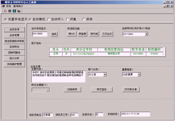 客戶打入電話后,當(dāng)系統(tǒng)的自動(dòng)語(yǔ)音應(yīng)答子系統(tǒng)無(wú)法解決客戶問(wèn)題時(shí),客戶可選擇人工服務(wù),由企業(yè)客戶服務(wù)代表直接接聽(tīng)客戶電話,處理并解決客戶問(wèn)題。此時(shí)客戶同座席話務(wù)人員直接溝通,并同時(shí)記錄下該客戶的聯(lián)系方式,將相關(guān)數(shù)據(jù)添加入系統(tǒng)數(shù)據(jù)庫(kù);也可以在數(shù)據(jù)庫(kù)的支持下回答接受查詢卷煙/價(jià)格/限額/新品種、卷煙經(jīng)營(yíng)規(guī)范制度/卷煙專賣政策法規(guī)咨詢、通報(bào)最近暢銷卷煙的限額情況/通報(bào)最近增加的新品種/煙草公司召集的活動(dòng)通知、投訴和舉報(bào)違法經(jīng)銷行為、卷煙預(yù)訂、電話訪銷、滿意度調(diào)查等。