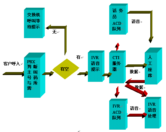 Server,CTI Server控制PBX執(zhí)行轉(zhuǎn)接任務(wù),呼叫進(jìn)入人工座席ACD隊(duì)列排隊(duì),如相關(guān)話務(wù)員有空閑,則執(zhí)行轉(zhuǎn)接操作。同時對于有些服務(wù),根據(jù)需要,CTI
