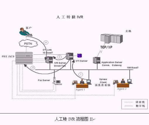 典型的客戶電話從人工服務(wù)轉(zhuǎn)接IVR的物理流程如下: