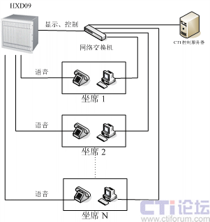 HXD09交換機(jī)的CTI 控制服務(wù)器,通過(guò)客戶端的DDE連接,將來(lái)電顯示號(hào)碼傳送到坐席的OPENVIEW系統(tǒng)。CTI 網(wǎng)絡(luò)系統(tǒng)可與辦公網(wǎng)絡(luò)系統(tǒng)共享同一臺(tái)網(wǎng)絡(luò)交換機(jī),或者使用獨(dú)立交換機(jī),客戶端安裝兩網(wǎng)卡兩種方式運(yùn)行。