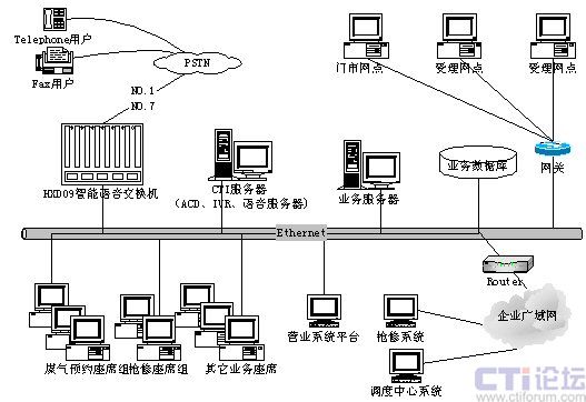 呼叫中心系統(tǒng)的網(wǎng)絡(luò)拓?fù)浣Y(jié)構(gòu)如下圖所示: