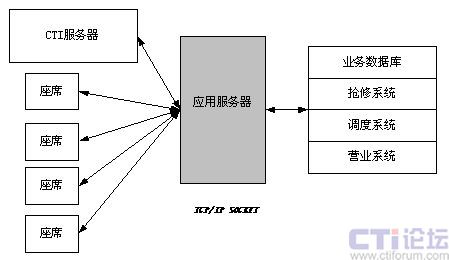 Ο數(shù)據(jù)接口采用三層C/S結(jié)構(gòu),通過(guò)構(gòu)建功能強(qiáng)大的應(yīng)用服務(wù)器,把呼叫中心的數(shù)據(jù)流與燃?xì)夤究蛻粝到y(tǒng)、營(yíng)業(yè)系統(tǒng)、搶修系統(tǒng)和燃?xì)庹{(diào)度系統(tǒng)結(jié)合起來(lái),充分利用了已有系統(tǒng)標(biāo)準(zhǔn)的數(shù)據(jù)接口,實(shí)現(xiàn)對(duì)后臺(tái)數(shù)據(jù)庫(kù)的訪問(wèn)。如圖: