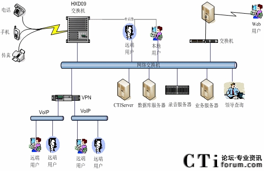 本系統(tǒng)物理結(jié)構(gòu)由交換機(jī)、CTI服務(wù)器、IVR(交互式語音應(yīng)答、服務(wù)器、業(yè)務(wù)代表座席(邏輯上分為:普通業(yè)務(wù)代表座席、專家座席等)、班長座席、統(tǒng)計(jì)維護(hù)管理工作站、因特網(wǎng)(WEB)服務(wù)器、電子郵件(EMAIL)服務(wù)器、數(shù)據(jù)庫/應(yīng)用服務(wù)器、錄音留言工作站、領(lǐng)導(dǎo)查詢工作站、業(yè)務(wù)網(wǎng)關(guān)服務(wù)器、通信網(wǎng)關(guān)、網(wǎng)絡(luò)系統(tǒng)等構(gòu)成。