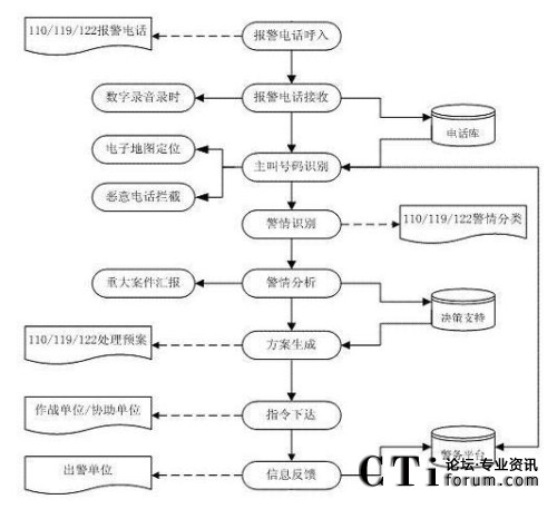 該系統(tǒng)主要分為電信子系統(tǒng)(完成聯(lián)動中心與各電信公司之間話音的傳輸、交換和分配,以及主叫號碼和主叫地址的自動查詢和傳輸?shù)龋、接警中心子系統(tǒng)(統(tǒng)一接聽和處理市民的報(bào)警、求助電話)、指揮調(diào)度子系統(tǒng)(或稱為處警中心,通過直觀的地理信息系統(tǒng)和數(shù)據(jù)庫,可以對所有的資源和警力分布了如指掌。通過一體化的無線數(shù)據(jù)傳輸和無線調(diào)度臺進(jìn)行方便的統(tǒng)一管理,指揮和調(diào)度)、信息網(wǎng)絡(luò)子系統(tǒng)(聯(lián)動中心的骨干網(wǎng)絡(luò),把各種數(shù)據(jù)數(shù)庫、接處警席位、移動的警用車載計(jì)算機(jī)等互聯(lián)在一起,形成一個強(qiáng)大的信息網(wǎng)絡(luò))、無線指揮調(diào)度通信子系統(tǒng)、大屏幕顯示子系統(tǒng)、地理信息子系統(tǒng)、GPS/GIS子系統(tǒng)。