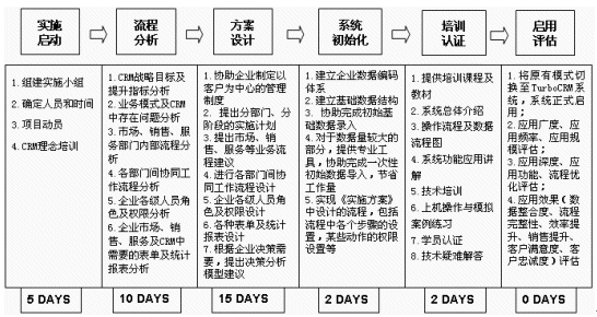 根據(jù)東風(fēng)設(shè)備廠作為傳統(tǒng)國營制造企業(yè)的特點(diǎn),TurboCRM的實(shí)施顧問將系統(tǒng)實(shí)施分為實(shí)施啟動(理念導(dǎo)入)、流程分析(業(yè)務(wù)梳理)、方案設(shè)計(流程固化)、系統(tǒng)初始化(系統(tǒng)部署)、培訓(xùn)認(rèn)證、啟用評估六個階段,步步推進(jìn)。