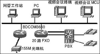 通過在BDCOM3660路由器上配置相應(yīng)的CE1、語音等功能模塊,中心20個(gè)E1接口可通過SDH連接17個(gè)地市氣象局和重要的氣象站(共20個(gè)),同時(shí)可供20部電話用以VoIP通話;中心BDCOM3660路由器每臺(tái)配兩個(gè)10/100M以太網(wǎng)端口,使得數(shù)據(jù)和視頻分開,防止網(wǎng)絡(luò)的廣播風(fēng)暴。