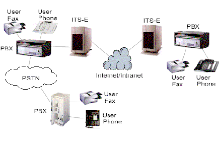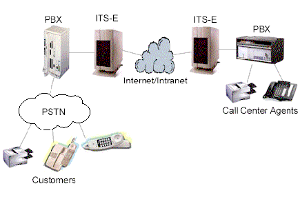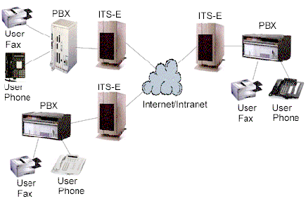許多公司有多個(gè)辦公地點(diǎn),各地之間有著頻繁的通訊往來(lái),電話(huà)和傳真。典型地,通訊涉及到公用交換電話(huà)網(wǎng)(PSTN)或PBX間的私人連接路線。Internet電話(huà)服務(wù)器(ITS-E)提供了另一選擇。基本原理是一處用戶(hù)撥打的電話(huà)經(jīng)本地PBX路由到本地ITS-E,本地ITS-E通過(guò)IP網(wǎng)絡(luò)送到目的地ITS-E,目的地ITS-E再將電話(huà)送到目的地PBX上,最后送到目的地電話(huà)或傳真機(jī)上。