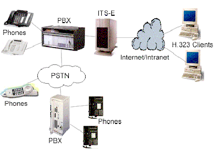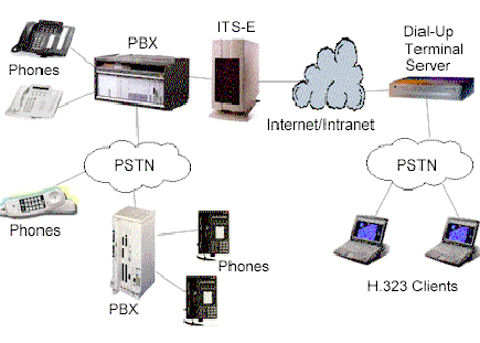 計(jì)算機(jī)IP電話(huà)產(chǎn)品,類(lèi)似網(wǎng)絡(luò)會(huì)議系統(tǒng),允許用戶(hù)使用他們當(dāng)前的IP聯(lián)接把通話(huà)接到電腦上去(如通過(guò)以太網(wǎng)聯(lián)接到他們的局域網(wǎng)中)。這種作法的局限是PC用戶(hù)只可以與另一PC用戶(hù)通話(huà)。然而,使用ITS-E,這種局限將不存在。任何在網(wǎng)絡(luò)上的PC可使用H.323(用于IP電話(huà)上的ITU-T標(biāo)準(zhǔn))軟件包來(lái)實(shí)現(xiàn)通話(huà),如微軟的網(wǎng)絡(luò)會(huì)議系統(tǒng),通過(guò)ITS-E服務(wù)器通至一個(gè)常規(guī)的電話(huà)使用者。電話(huà)用戶(hù)不需要任何新的裝備,甚至不會(huì)意識(shí)到聲音是從PC機(jī)中傳出及在IP網(wǎng)絡(luò)中傳輸。示意圖如下: