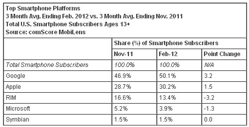 按截至今年2月份的三個(gè)月的平均數(shù)計(jì)算,美國(guó)智能手機(jī)用戶數(shù)超過(guò)1.04億人,相比截止去年11月的三個(gè)月的平均數(shù)增長(zhǎng)14%。谷歌Android操作系統(tǒng)在美國(guó)手機(jī)市場(chǎng)的份額超過(guò)50%,相比去年同期上升了17個(gè)百分點(diǎn);蘋(píng)果iOS操作系統(tǒng)排名第二,其市場(chǎng)份額為30.2%(與去年同期相比上升了5個(gè)百分點(diǎn));其后依次是RIM黑莓操作系統(tǒng)的13.4%,微軟Windows